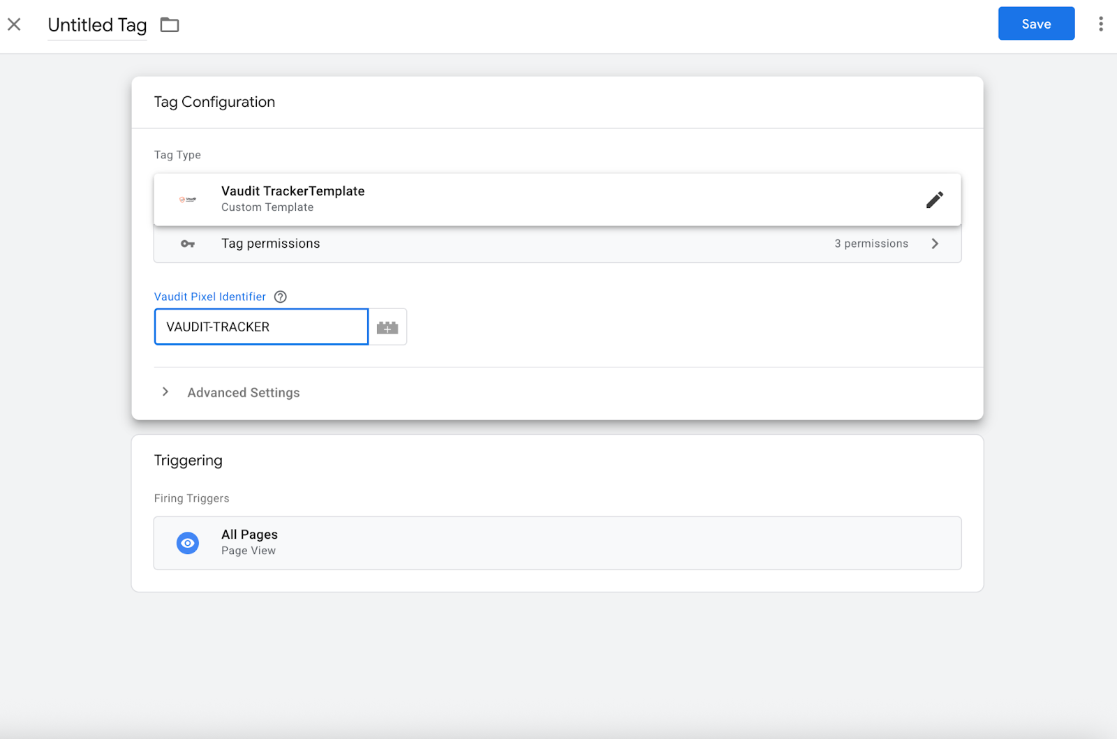 - Give your tag a clear name (e.g., "Vaudit Pixel").