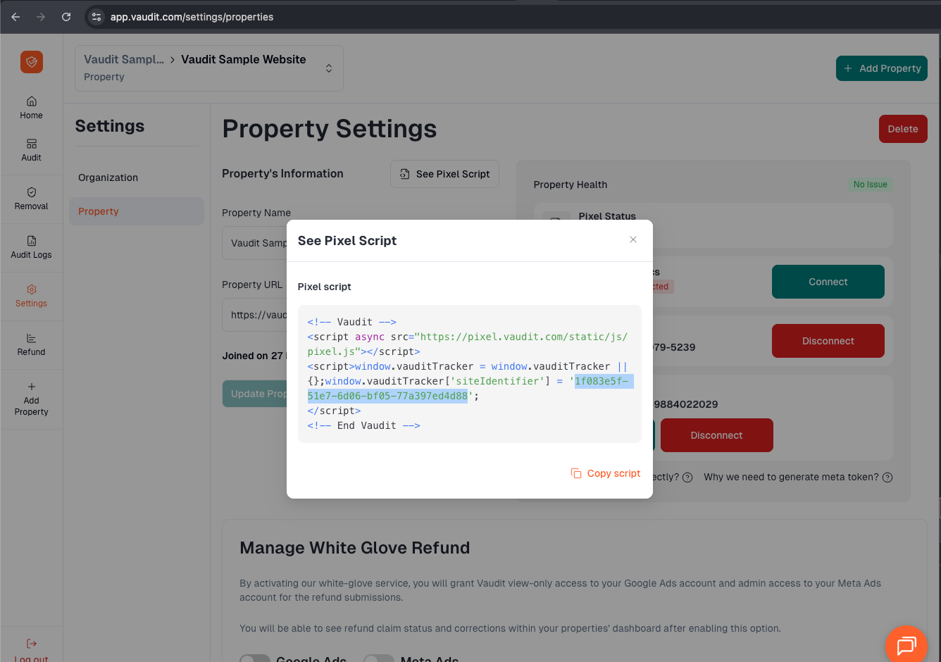 You can find this by logging into your Vaudit dashboard and navigating to Settings > Property. There you will see the See Pixel Script Button as follows.Please copy the siteIdentifier from the pixel script which you will need in the next steps.